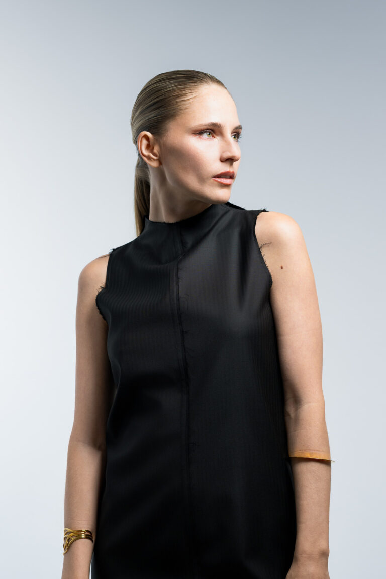 Fashion Editorial Aufnahme von Natascha Polké mit schwarzem Kleid – zeitlose Modefotografie vor neutralem Studiohintergrund.Fashion Editorial Shooting – Kollaboration mit Natascha Polké