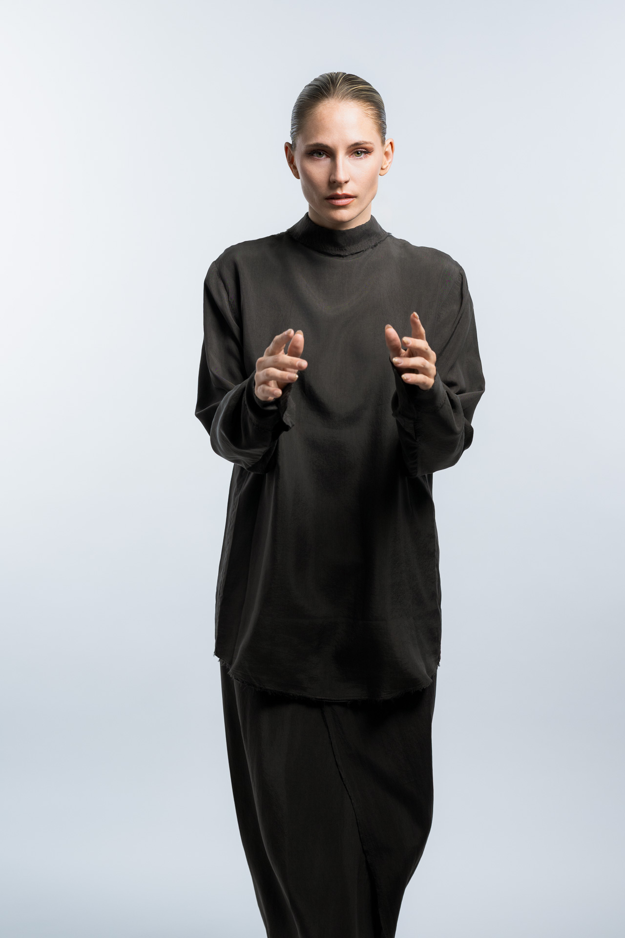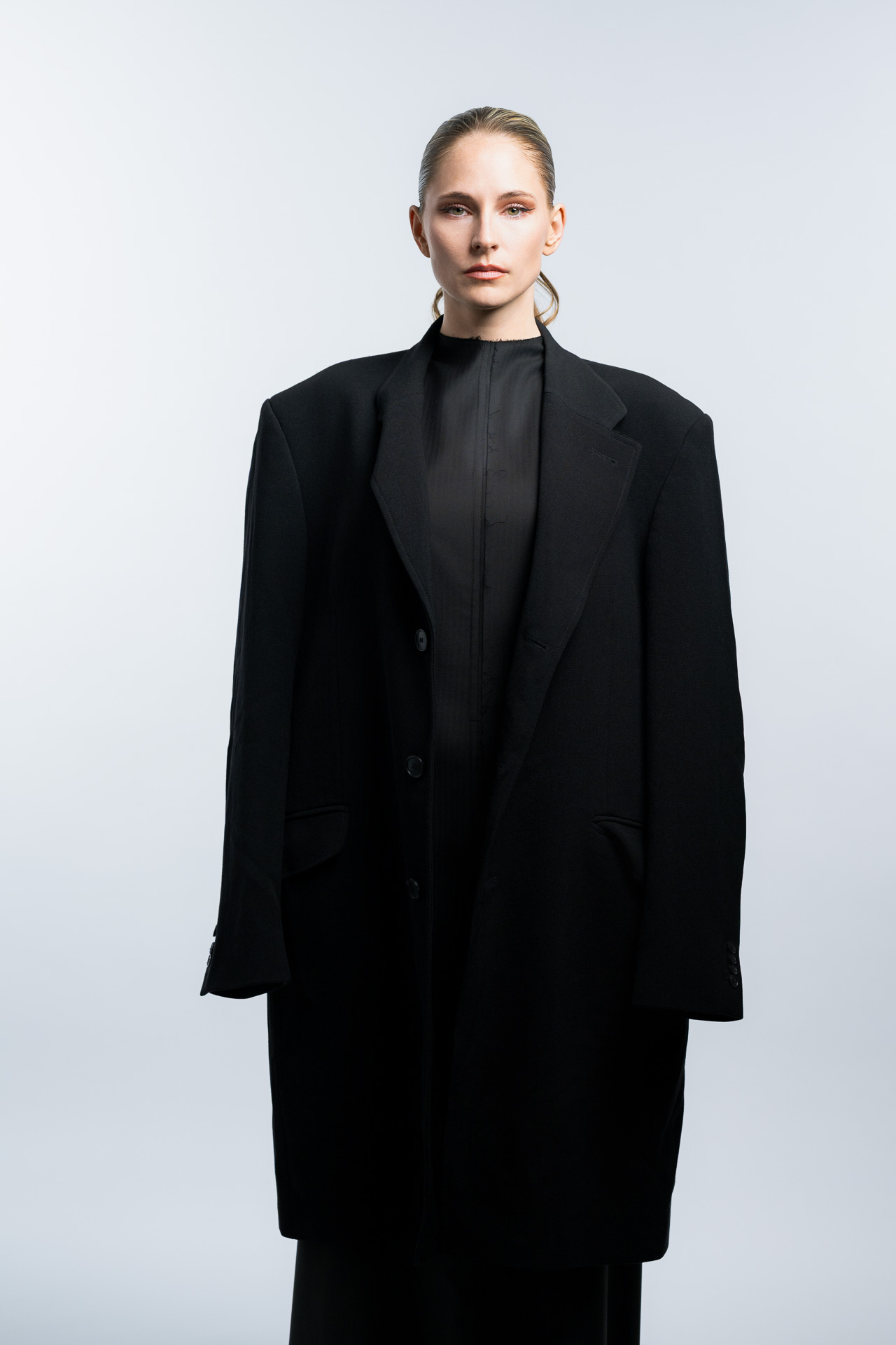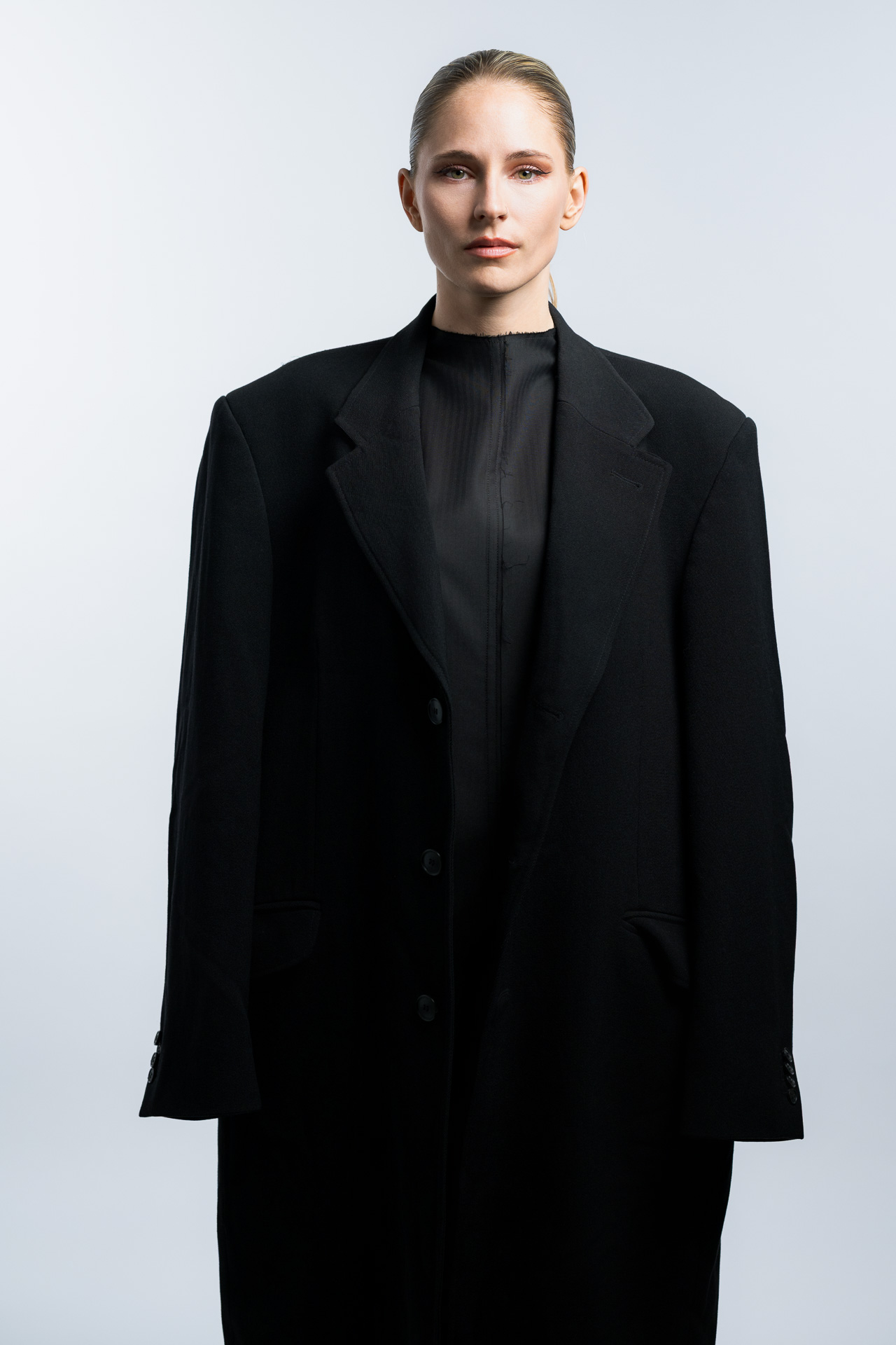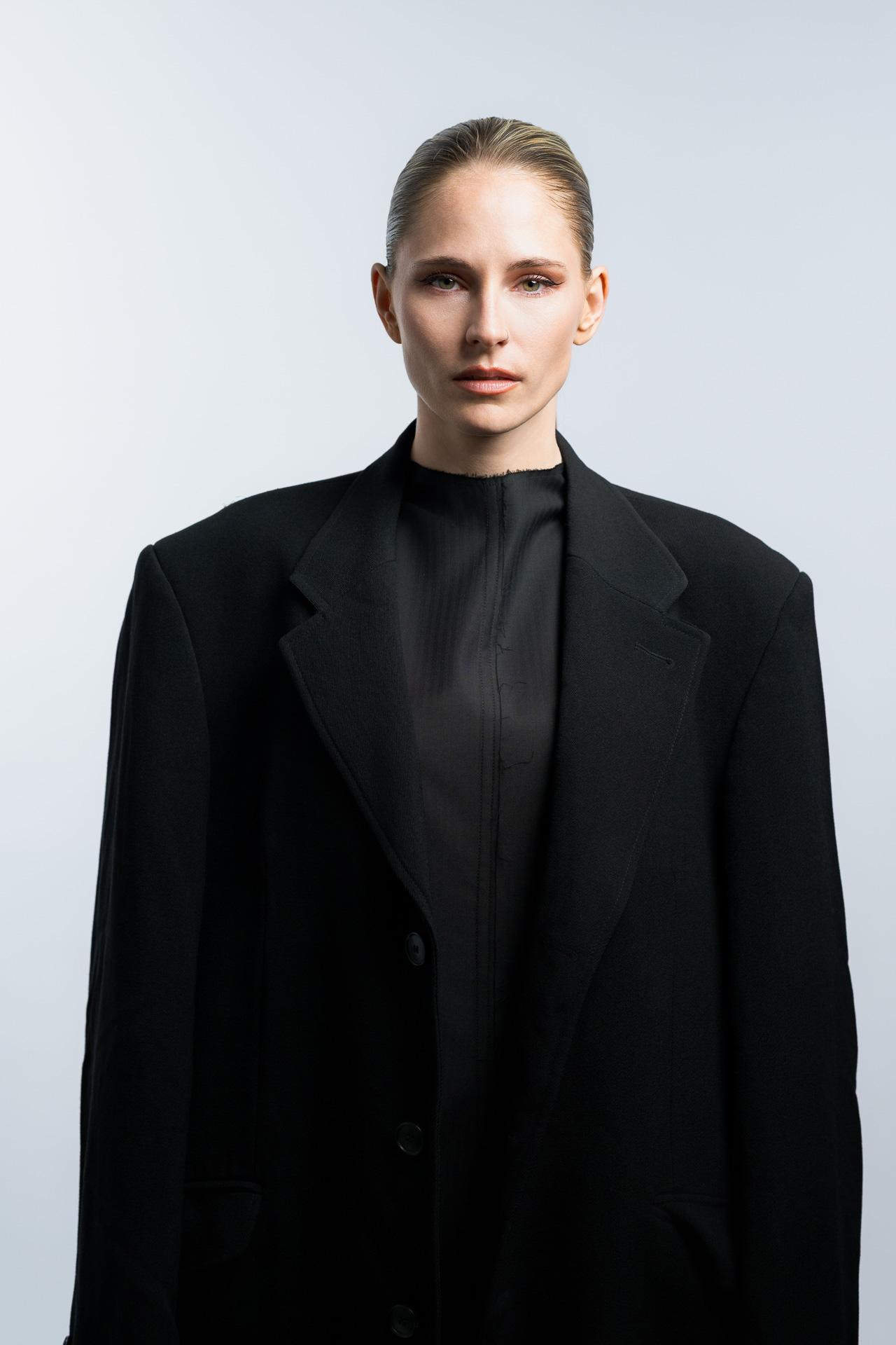 Das Konzept basiert auf klaren Formen, minimalistischer Lichtführung und einer ruhigen Farbpalette. Im Studio entstanden Fashion Portraits, die den Fokus vollständig auf Ausdruck, Haltung und Silhouette legen. Die reduzierte Inszenierung verstärkt die grafische Wirkung der Kleidung und erzeugt eine Bildsprache, die an klassische Editorial Fotografie aus internationalen Modemagazinen erinnert.