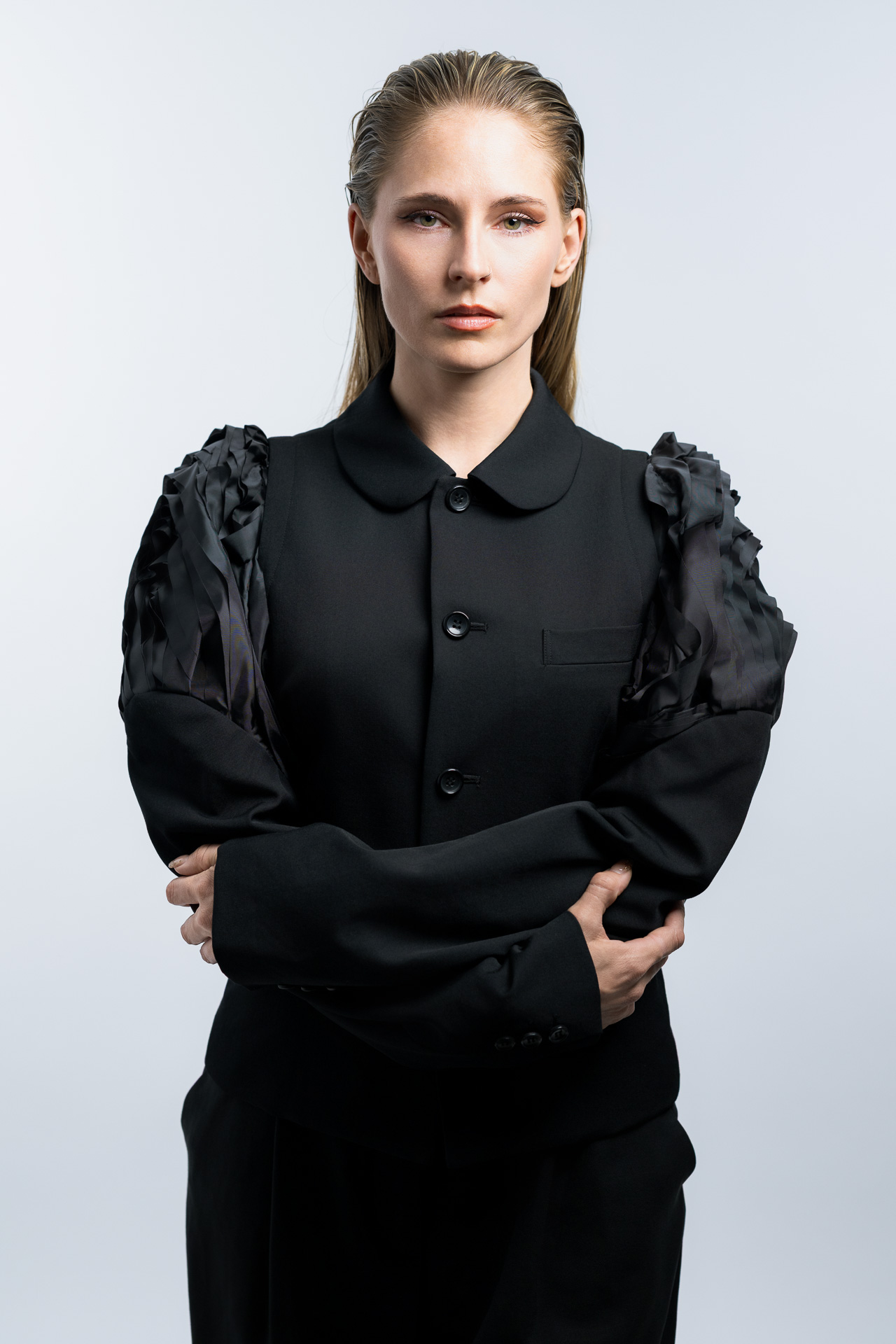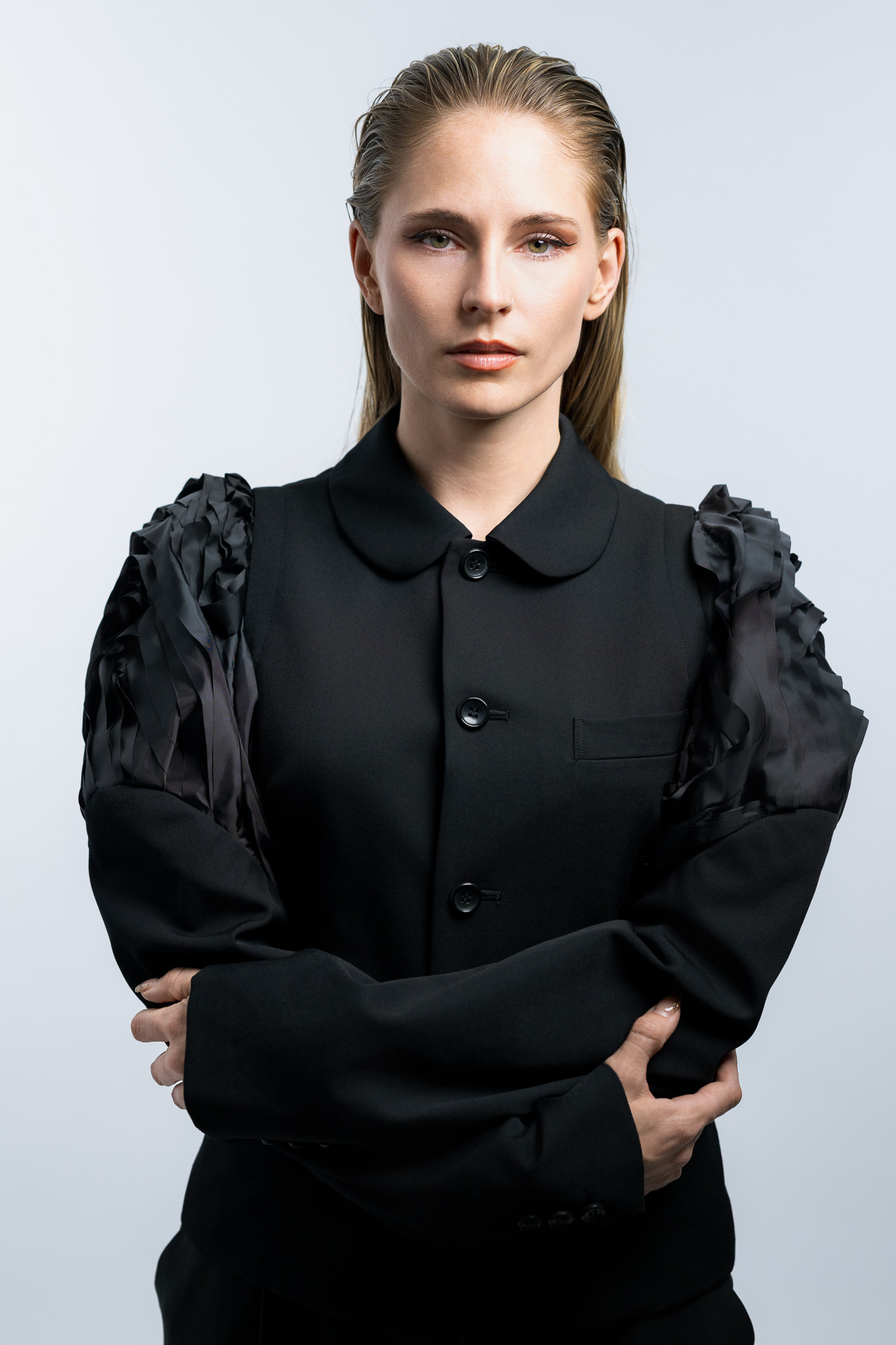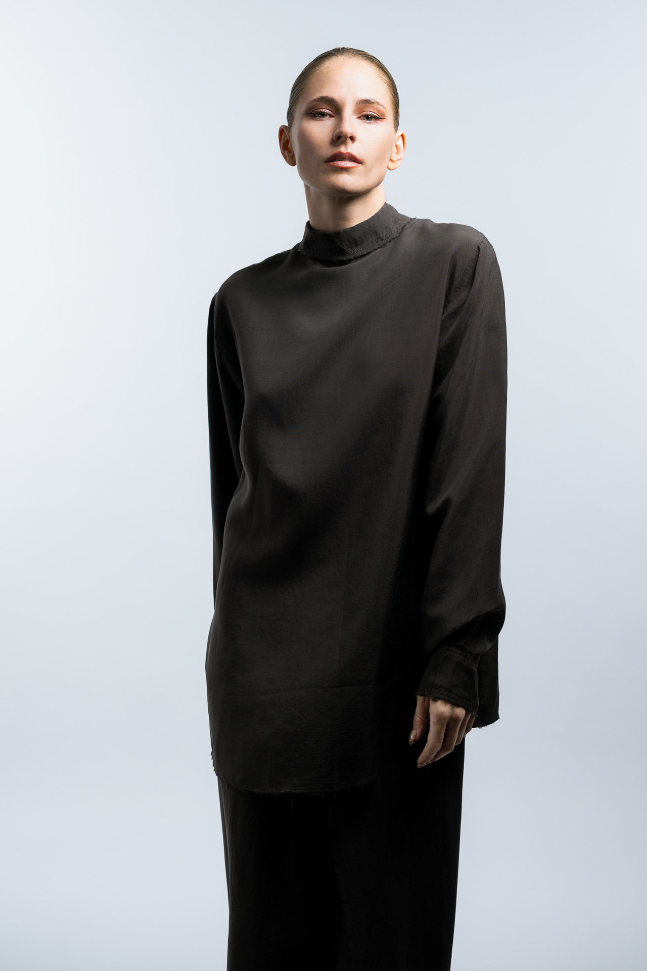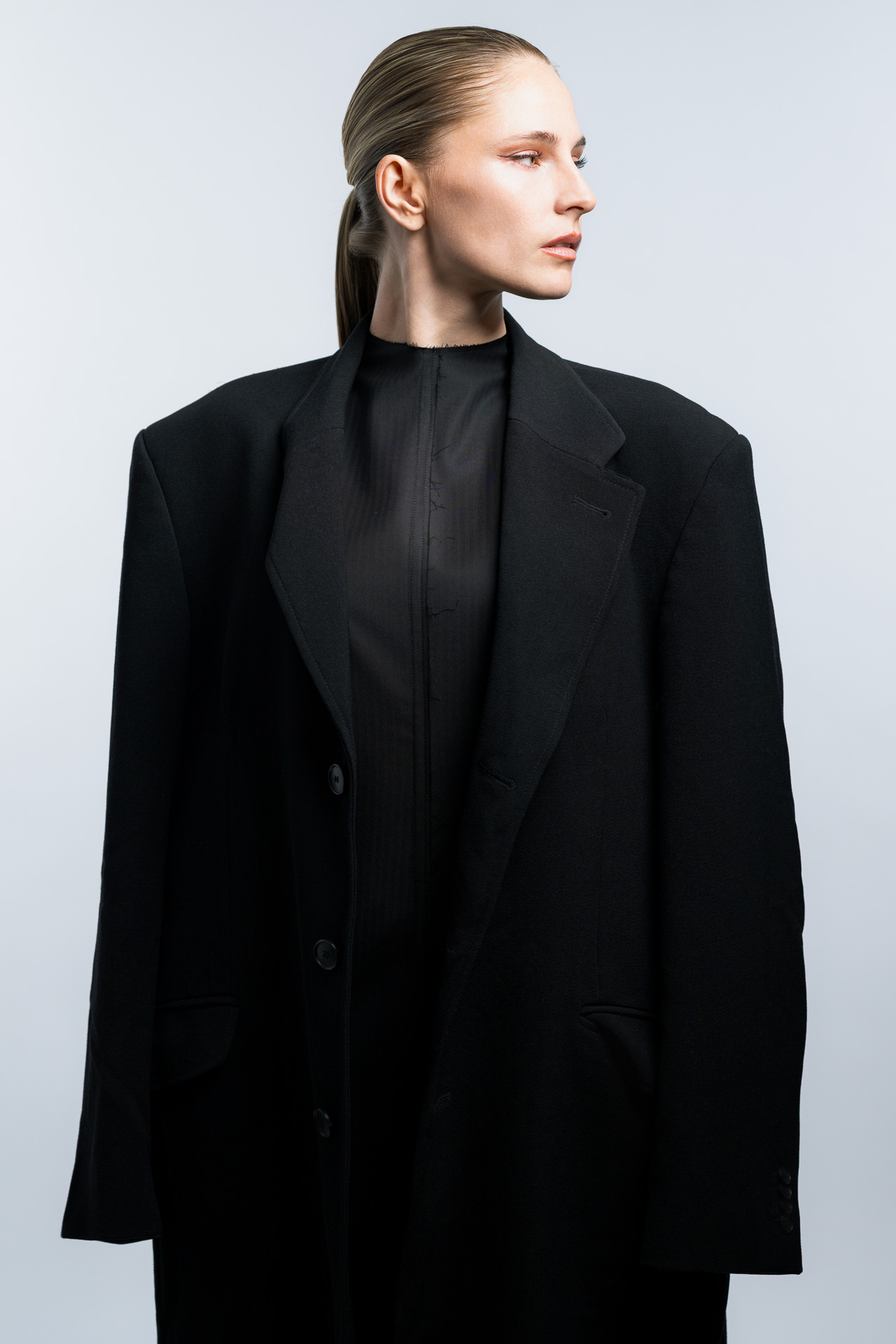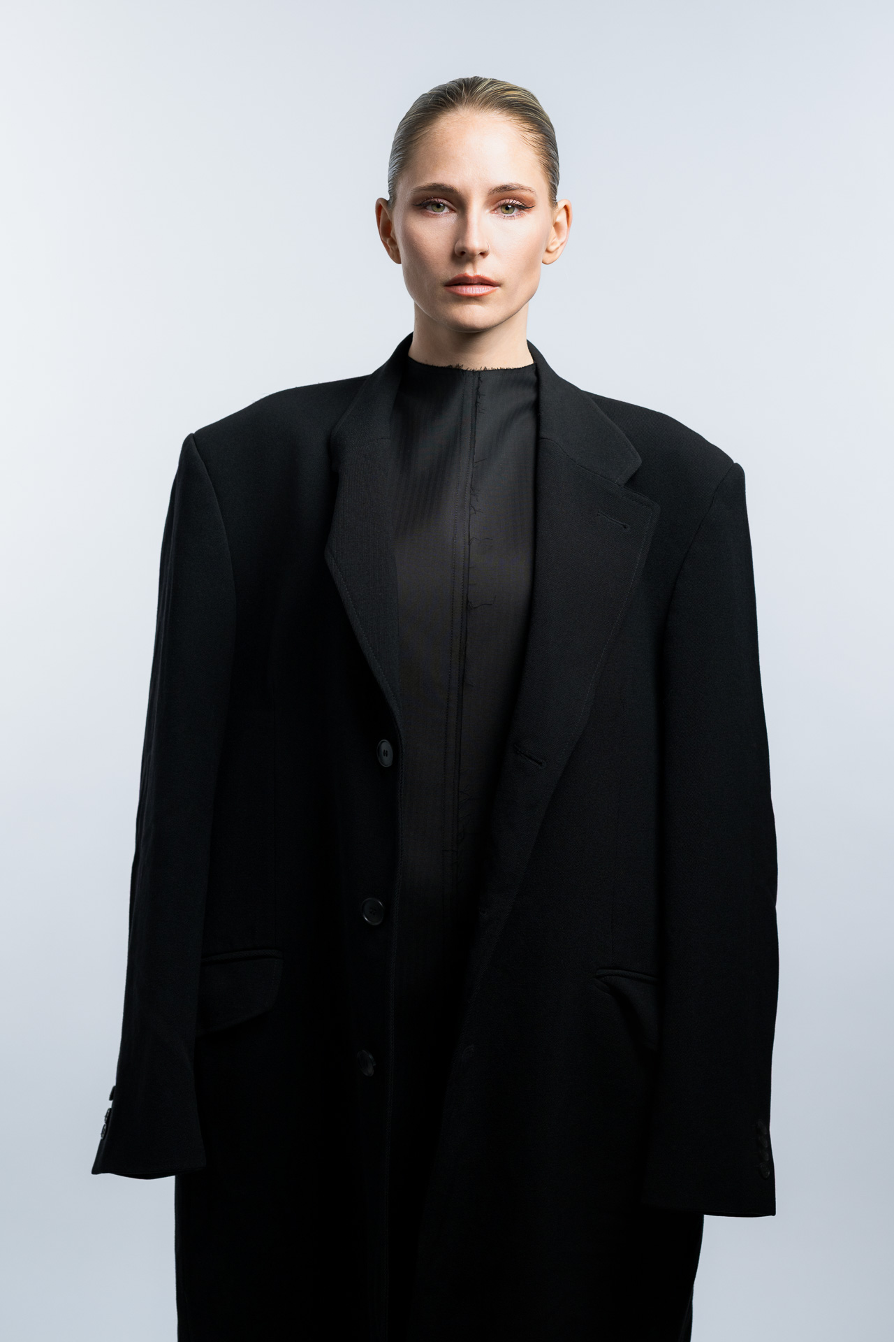 Das Konzept basiert auf klaren Formen, minimalistischer Lichtführung und einer ruhigen Farbpalette. Im Studio entstanden Fashion Portraits, die den Fokus vollständig auf Ausdruck, Haltung und Silhouette legen. Die reduzierte Inszenierung verstärkt die grafische Wirkung der Kleidung und erzeugt eine Bildsprache, die an klassische Editorial Fotografie aus internationalen Modemagazinen erinnert.