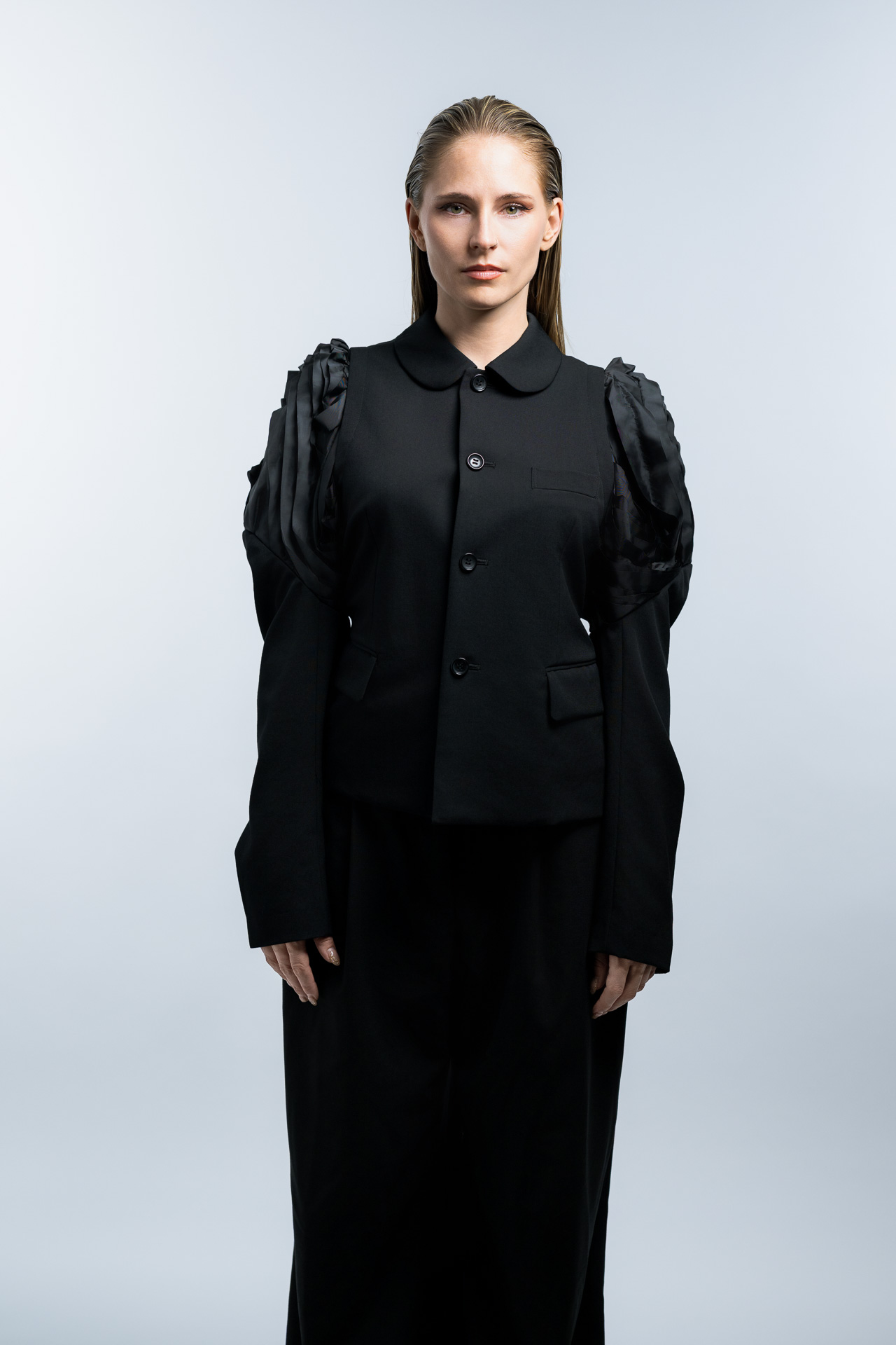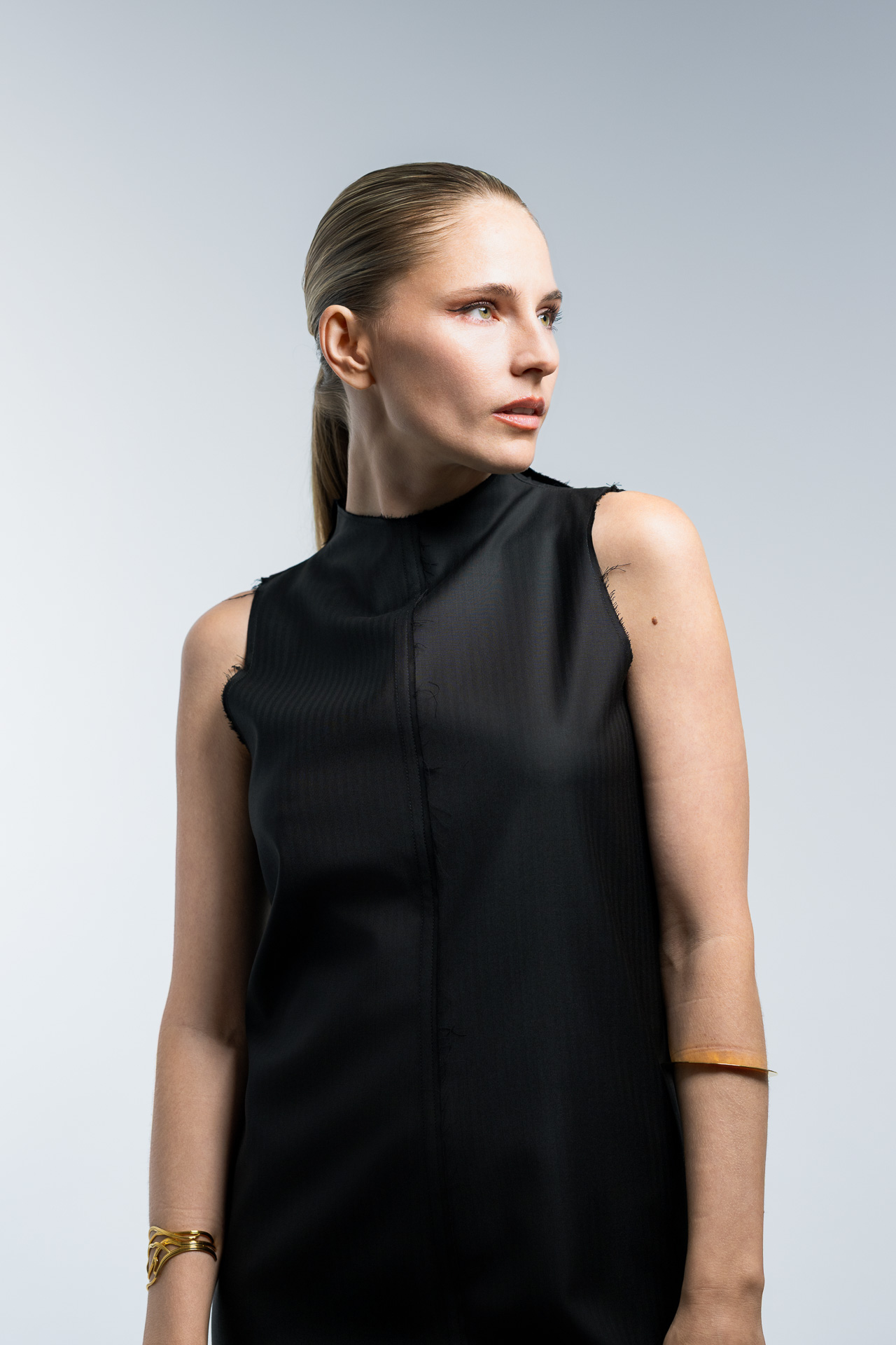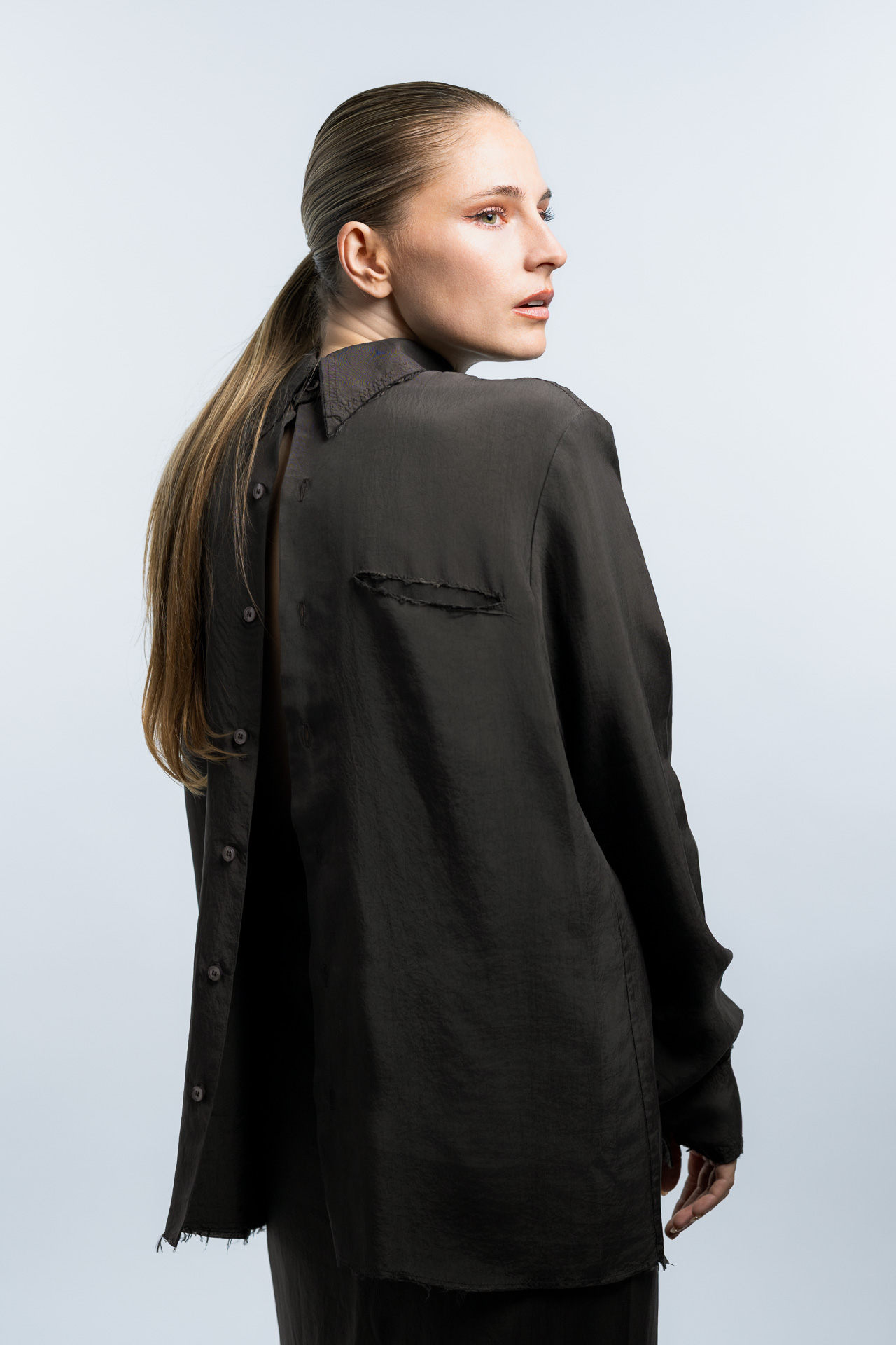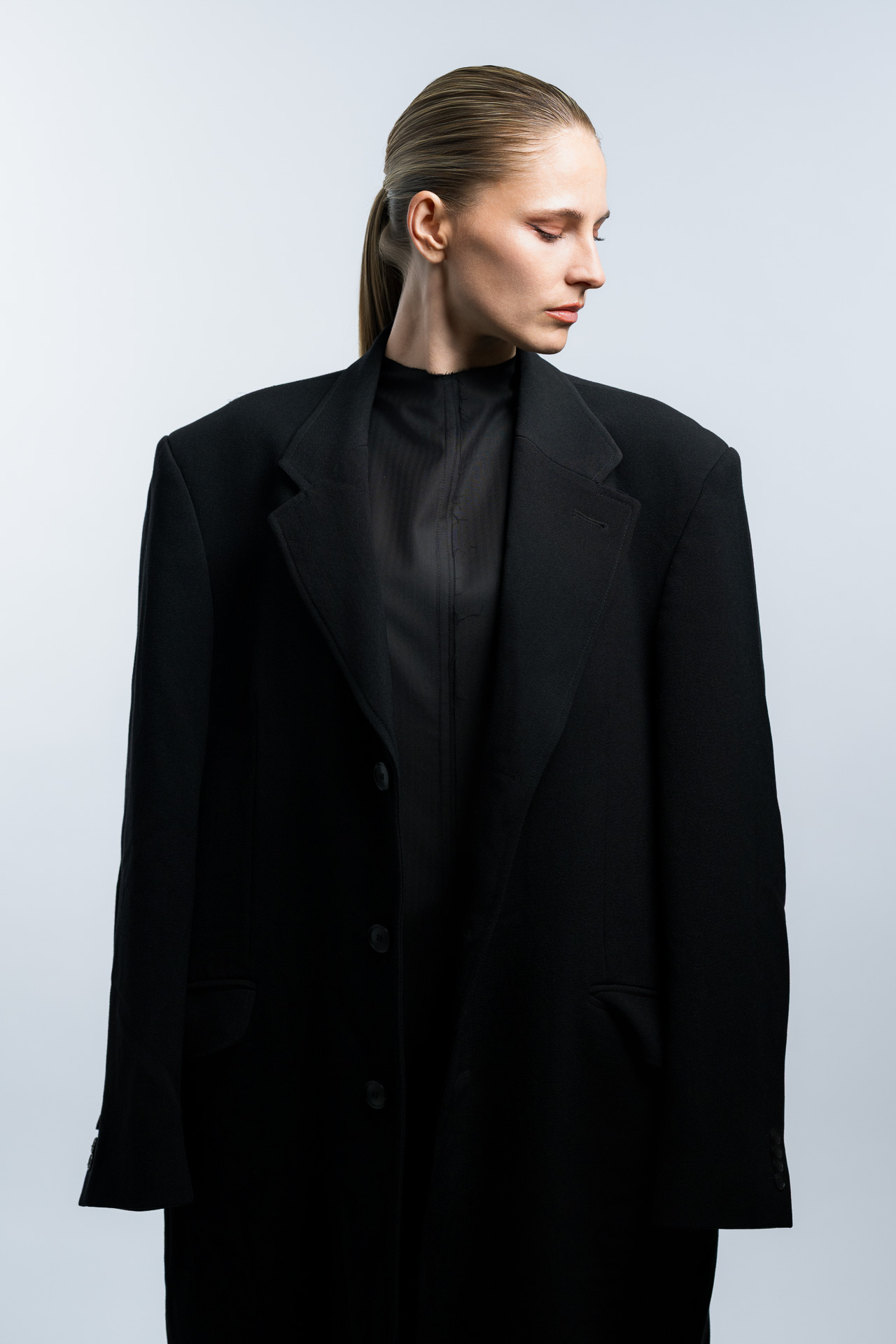 Das Konzept basiert auf klaren Formen, minimalistischer Lichtführung und einer ruhigen Farbpalette. Im Studio entstanden Fashion Portraits, die den Fokus vollständig auf Ausdruck, Haltung und Silhouette legen. Die reduzierte Inszenierung verstärkt die grafische Wirkung der Kleidung und erzeugt eine Bildsprache, die an klassische Editorial Fotografie aus internationalen Modemagazinen erinnert.